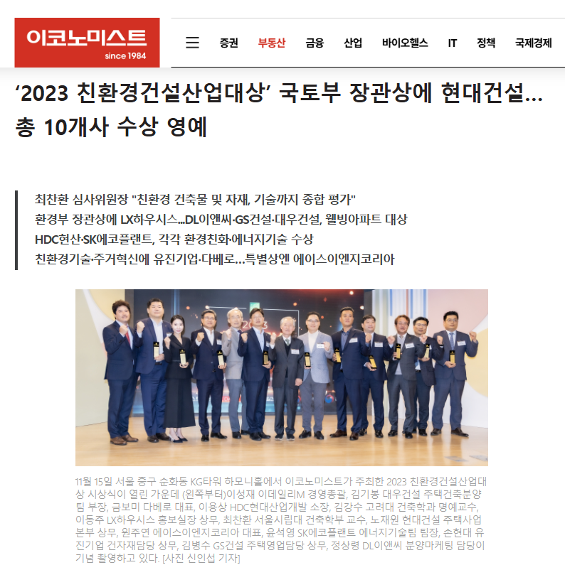 에이스이엔지코리아 그룹이 2023 친환경건설산업대상 특별상을 수상했습니다.